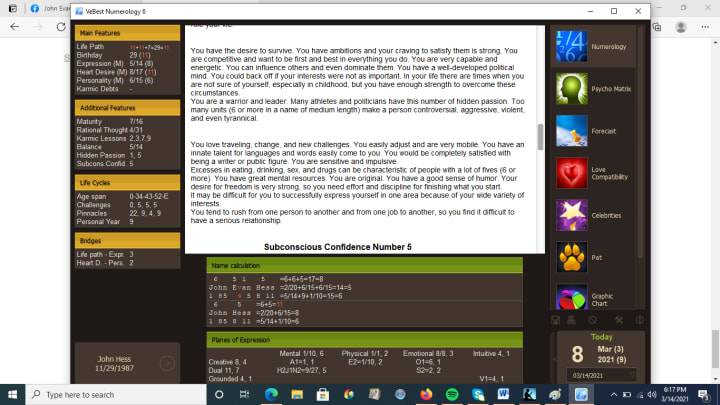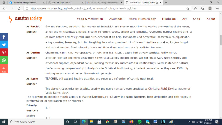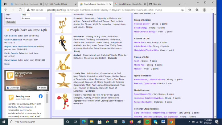 While I will leave that up to the reader to decide, I will not budge on the accuracy of "the science" that speaks for itself and many aren't aware of (and mock if they are made aware of it without investigating). It frustrates me that on my Facebook page, I always see people doing Nametests that give them common vague paragraph results, in addition to no negatives at all. If there is a test about their "one negative," it will always "really be a positive in disguise." If there is a "narcissist vs. empath" test, it will always give them "100% empath" from what I've seen, even if Peoplay says the opposite from their birth information. It is abundantly clear to me that most people do not care about the actual truth (as it says I do in my 2 Sanatan destiny), but what they want to be true, and they will shut down and deny any negatives that come up. As one book I read once said, they are incapable of deep self-knowledge because of this. I also once read somewhere that Trump (a 5 dayer) said he would be afraid to look at such an analysis because of what it might say, which confirms what I'm saying. To say that "it takes courage," as some have, to look at it and acknowledge it to me is ridiculous, but nevertheless still seems to be true.