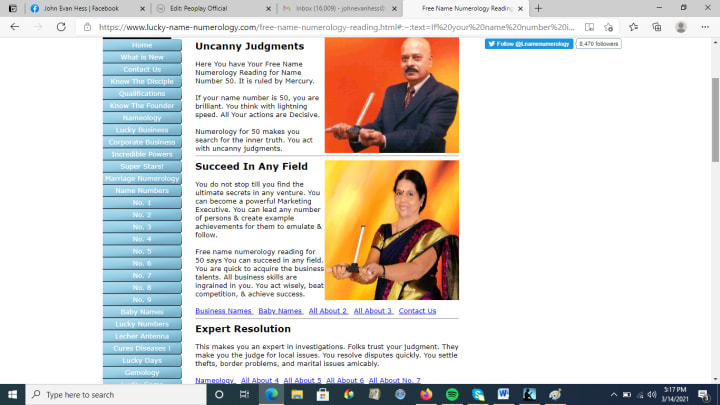 As it says in the story, I've learned that if your name adds up to 50, as mine does, it means you are well-suited to be a judge or professor, and it also says that you "do not stop until you find the ultimate secrets in any venture." While I, John Evan Hess, don't claim to have accomplished this fully, it is certainly my goal, and I hope the reader will enjoy the forthcoming research that I have done so far. Although I neglected to mention it in the story, another good example is Judge Judy, whose full birth name, Judith Susan Blum, also adds up to 50. Although there are many sites that have the correct number values, this site is a good one to go to if one does not have them memorized like Henry Dowdy does. At that site, you can also find a list of celebrities and their numbers, where Carl Gustav Jung and Jo Raquel Tejada (Raquel Welch) are also listed as 50.