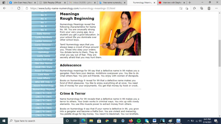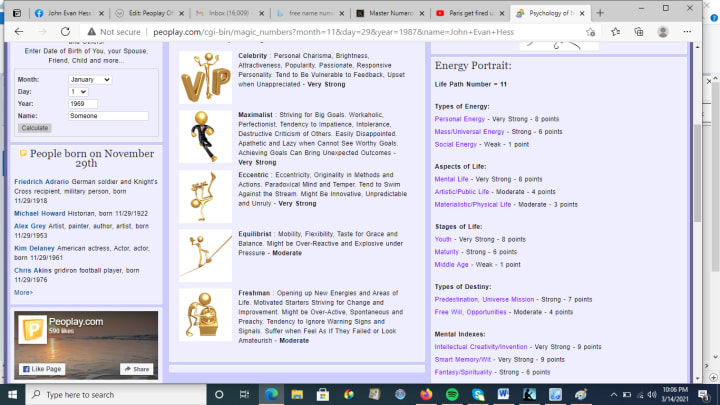 Besides laughter, it also described intimate details such as my preferences in the bedroom, which I imagine is one of the things that numerologists are talking about when they say that they do not want to give it publicly in their superficial readings. But nevertheless, I found it to be accurate and representative of the specific possibilities contained in numerology (and if you really want to know, you can find it). In fact, towards the bottom of my name number page, it says that because of the combination of my 5 name number (reduced from 50) and 2 life path (destiny in Sanatan), I can "become a great poet, writer, and a captivating speaker," and one of the people with the same combination is Todd, who was a captivating speaker. Another example is Benjamin Aaron Shapiro. Seemingly subjective, different speakers, but equally captivating.