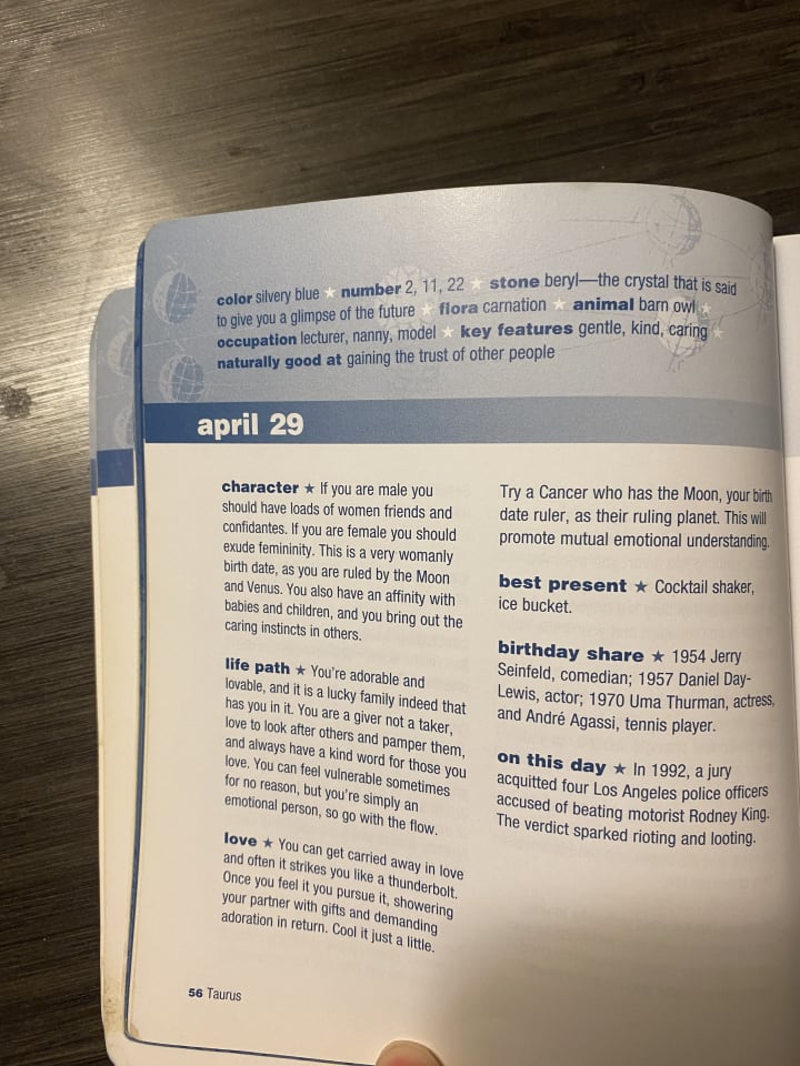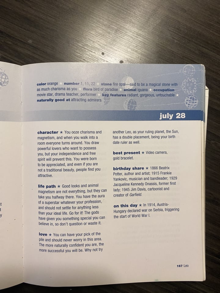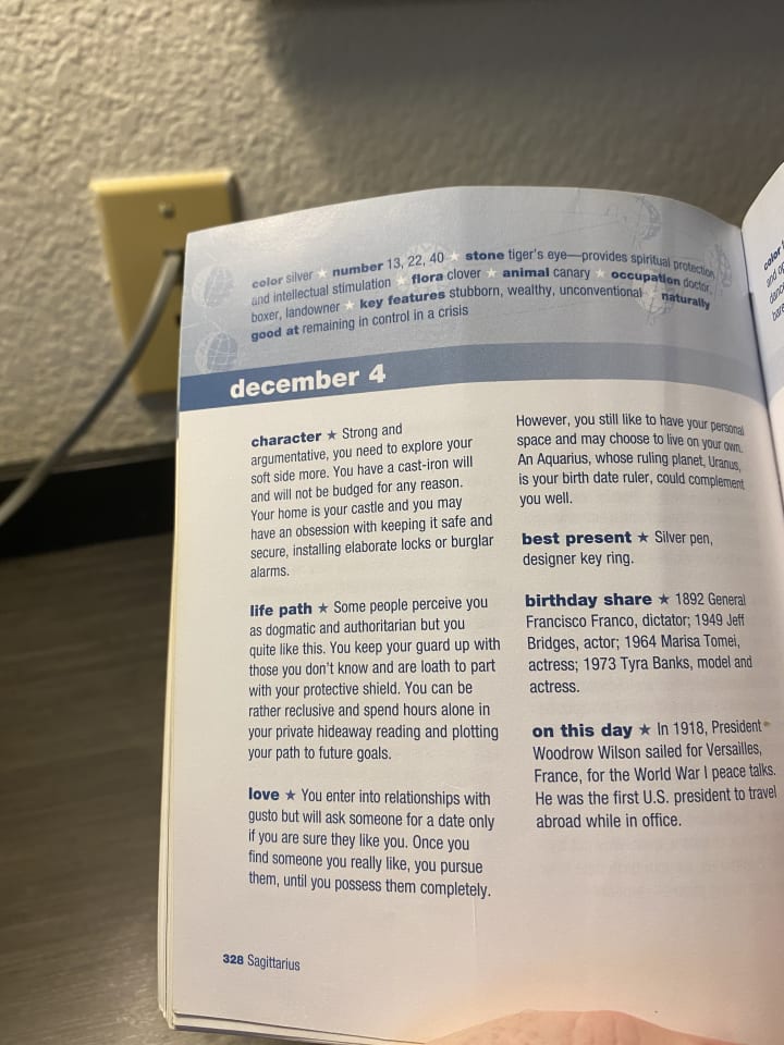 And finally, before I get to my chosen fact (and runner-up), I also think that it is fascinating that besides beauty, there is a day that predicts wealth in 365 Birthdays Interpreted (December 4th on page 328). After I read that, I started investigating, and the first example I found was Jay-Z, which almost cemented it already for me. Subsequent examples include Skip Bayless and Jeff Bridges.