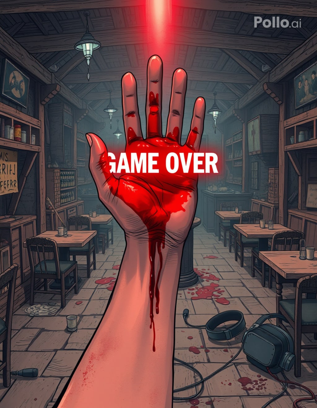 The tavern door creaked open. A man entered, oddly dressed in a modern suit, like a billiards referee. He walked slowly toward the bar, observing the scuffle for a moment. Then, without expression, he drew a gun from his belt, aimed at the attacker, and fired.