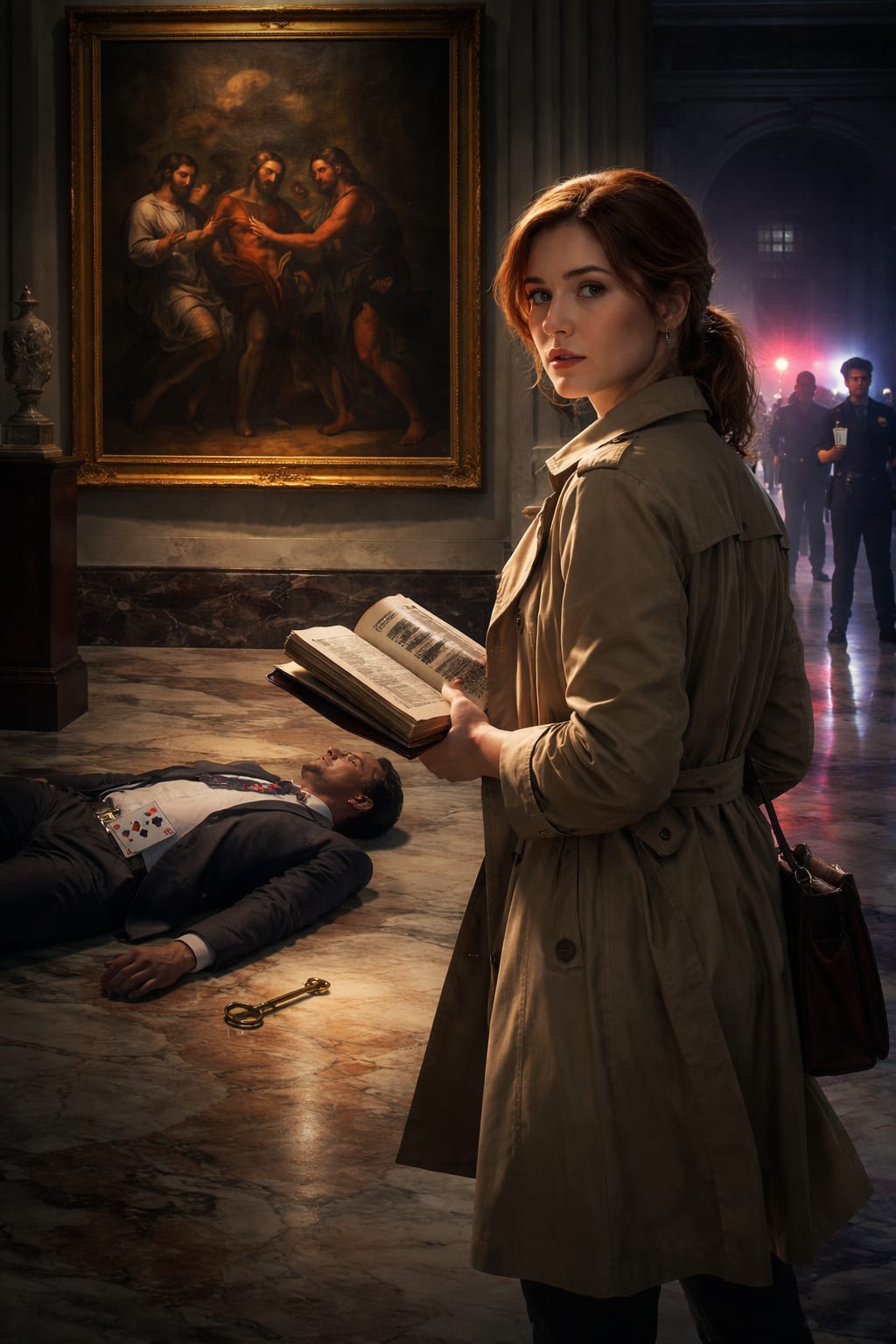 Dr. Evelyn Cross found the body at 6:47 PM, sprawled beneath the Caravaggio in Gallery Seven. Marcus Hendricks, the museum's head curator, lay face-up on the polished marble floor, his eyes fixed on the painting above him—*The Taking of Christ*. A single playing card, the Queen of Spades, rested on his chest.
