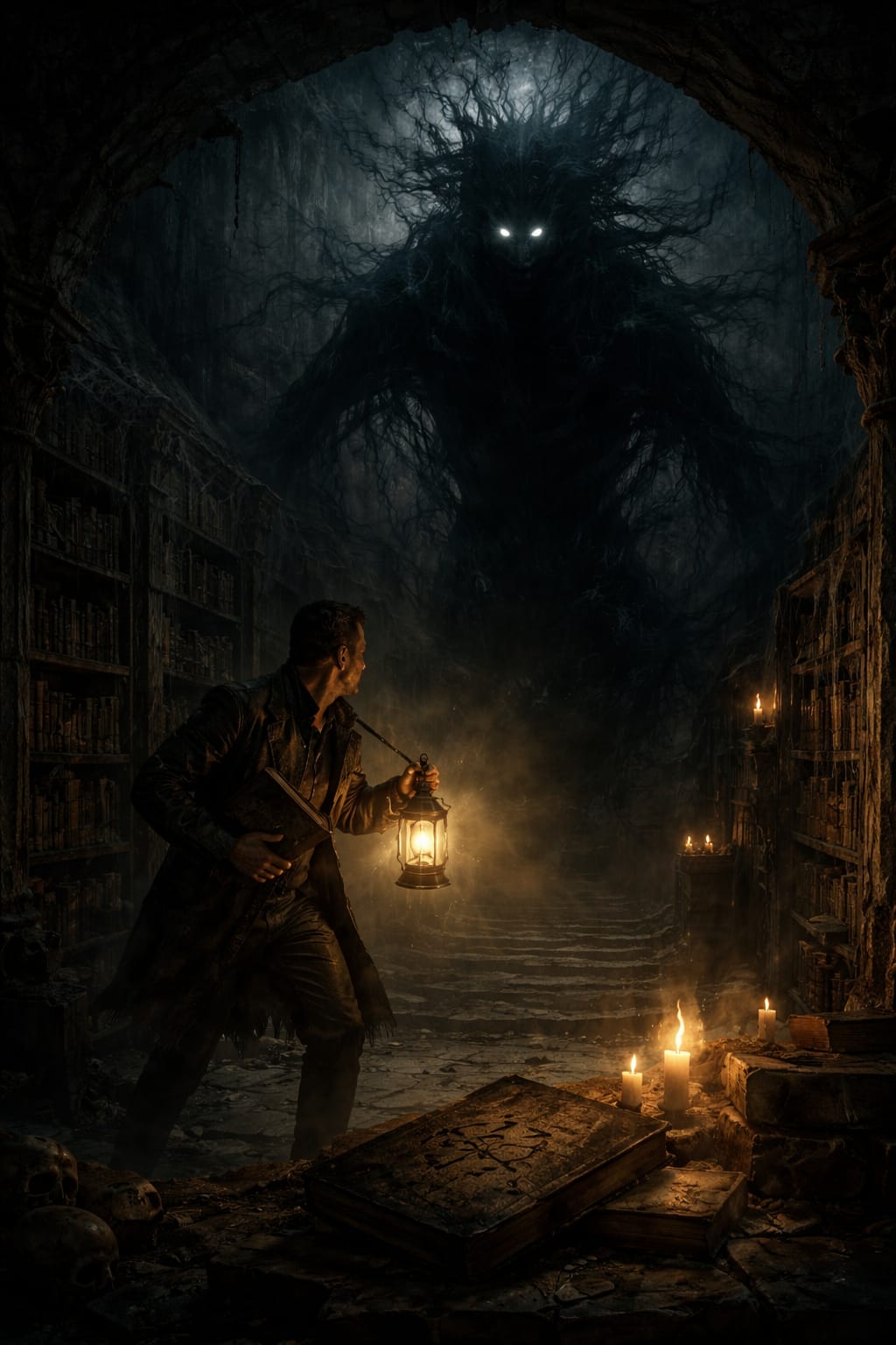 Dust fell from the ceiling. One of the shelves collapsed behind me, the manuscripts spilling like dead leaves. And then, from the darkness beyond the candlelight, I saw it.