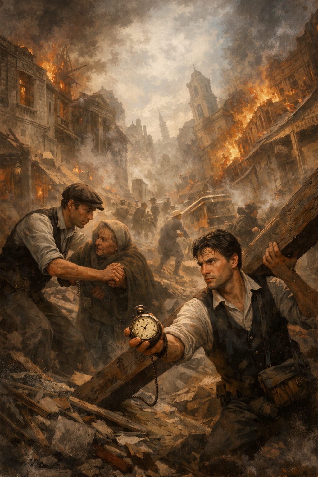 A figure caught his eye—a young man, no older than Elias himself, struggling to help an older woman out of a collapsing building. Something about him felt familiar.