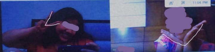 We turned on the cameras and folded out fingers to form the letters. Just when I decided to take a screenshot, two of my friends who were given the duty of forming O and E dropped out. Since they were together, they were logged in from one laptop.