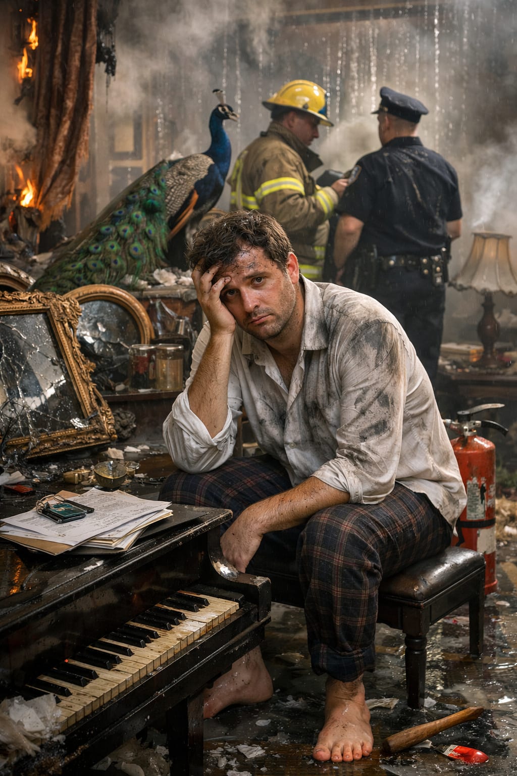 So when the police arrived and saw flames in the fourth-floor window, water pouring through the lobby ceiling, a bird screaming from somewhere in the dark, and me barefoot on a piano holding the remains of a fire extinguisher, I understand why things may have looked bad.