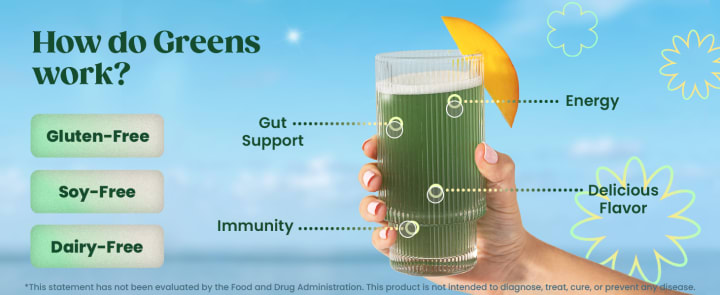 Additionally, the product provides natural energy derived from micronutrient-dense superfoods, matcha powder, and garden-fresh fruits and vegetables.